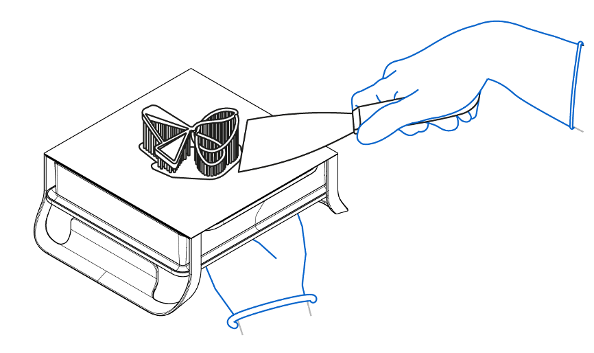 4. 若物件仍維持於成型平台上,使用移除工具或刮刀手動移除物件,或戴上手套手動拔下物件。 | |