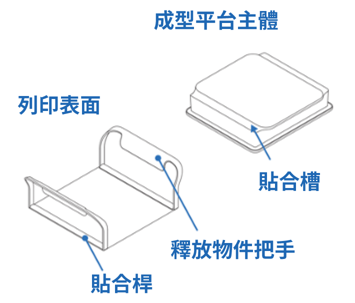 Formlabs 成型平台V2由兩個主要組件組成:成型平台主體和彈性列印表面。 列印表面以磁力方式附著於成型平台主體,並透過位於貼合槽內、貫穿成型平台主體頂部表面的磁鐵定位。當您向內擠壓把手時,列印表面彎曲,從而使列印的物件掉落,以便於進行後處理流程。