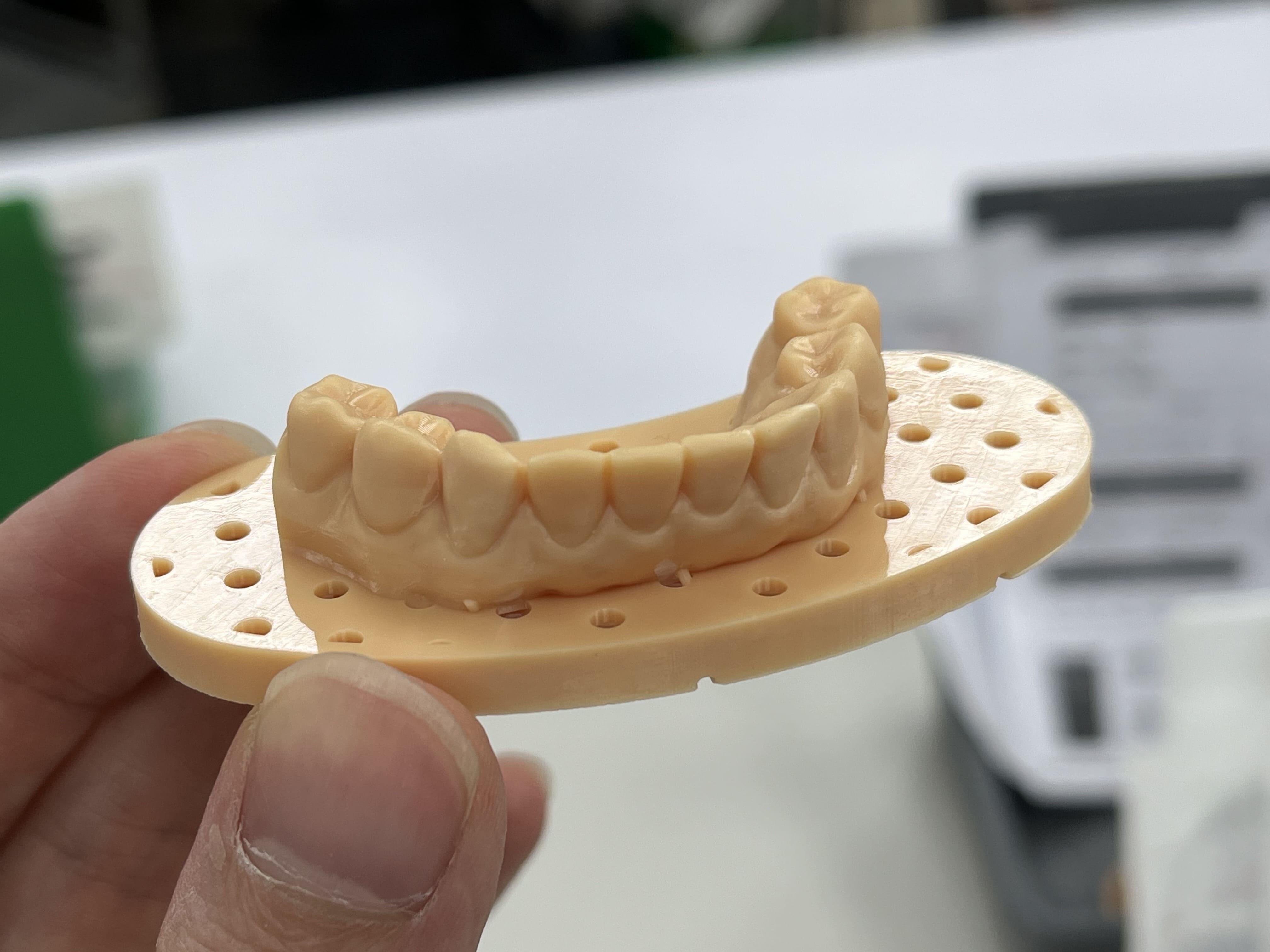 最大的困擾之一,是模型「不夠一致」。不同病患的牙弓大小不同、口掃品質不同,模型尺寸與外型一有變化,就必須重新調整列印參數。曝光、層厚、支撐位置,每一個細節都可能影響成敗。